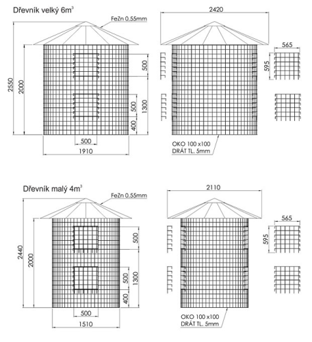 Dřevníky se mohou lišit v materiálu a barvě střechy.Základní varianta je