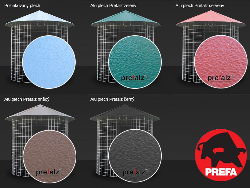 dodávána se střechou z pozinkovaného plechu FeZn 0,55mm, bez povrchové úpravy. Další varianty jsou vyráběny z hliníkového plechu Prefalz AlMg 0,7mm, v barvách: zelené, červené, hnědé, černé případně šedé. Dřevník speciál má střechu žárově zinkovanou spolu s celým pláštěm.